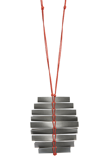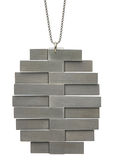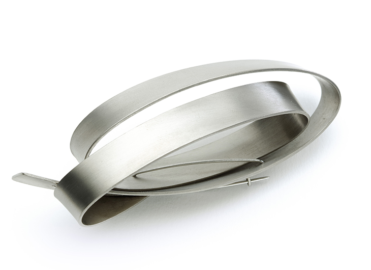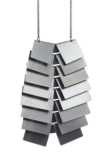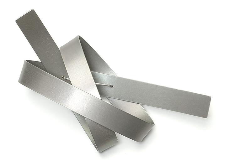 In Falten gelegt und gesteckt, schuppenartig überlappend oder verwoben reihen sich Elemente aus Titan zu grossformatigen beweglichen Anhängern und Broschen. Lineare Strukturen werden räumlich und rufen verschiedenste Assoziationen beim Betrachter hervor. Formen aus der Architektur verbinden sich mit Bildern aus Flora und Fauna. Es ist die Balance zwischen Materialität und Form, die mich an der Bearbeitung von Titan reizt. Seine Leichtigkeit, Elastizität und Härte sowie die in zahlreichen Grau-tönen schimmernde Farbigkeit, machen es für mich zu einem sinnlichen, Raum und Zeit überdauernden Material.